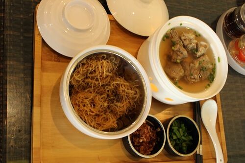 プーケットの食べ物 その2. これは、プーケットの華僑系の人のソウルフードだと思います。「ミーフンカドゥークムー」。ミーフン(ビーフン)カドゥーク(骨付き)ムー(豚) 醤油味で炒めたビーフンに、玉ねぎの揚げたものとニラがかかったものと、豚の骨…